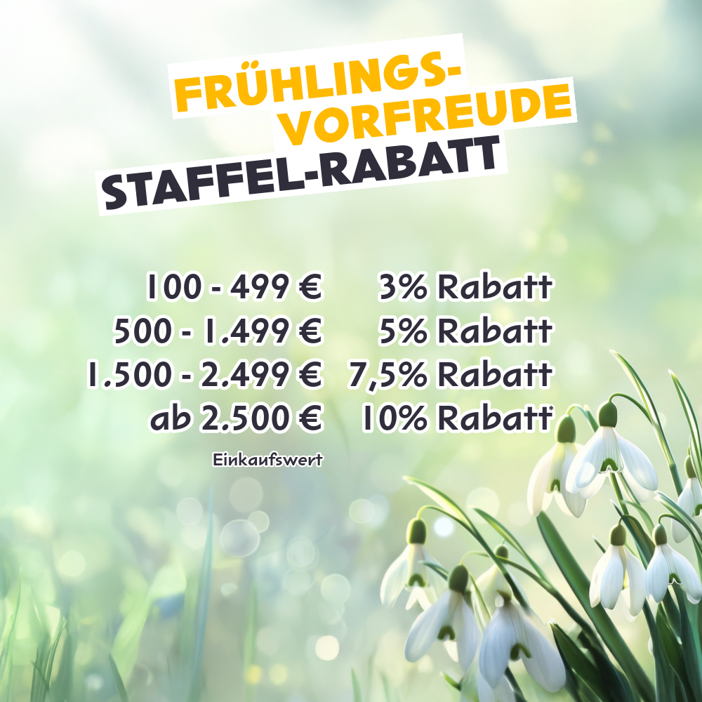*Der Aktionszeitraum läuft bis einschließlich 02.02.2026. Der Rabatt wird entsprechend des Einkaufswertes automatisch vom Warenkorbwert abgezogen. Der maximal mögliche Rabatt gilt immer bei Zahlung per Vorkasse. Spätester Termin für die Wunschlieferung im Frühjahr ist der 13.03.2026. Der Rabatt gilt nicht in Verbindung mit Individualangeboten und Montageleistungen.