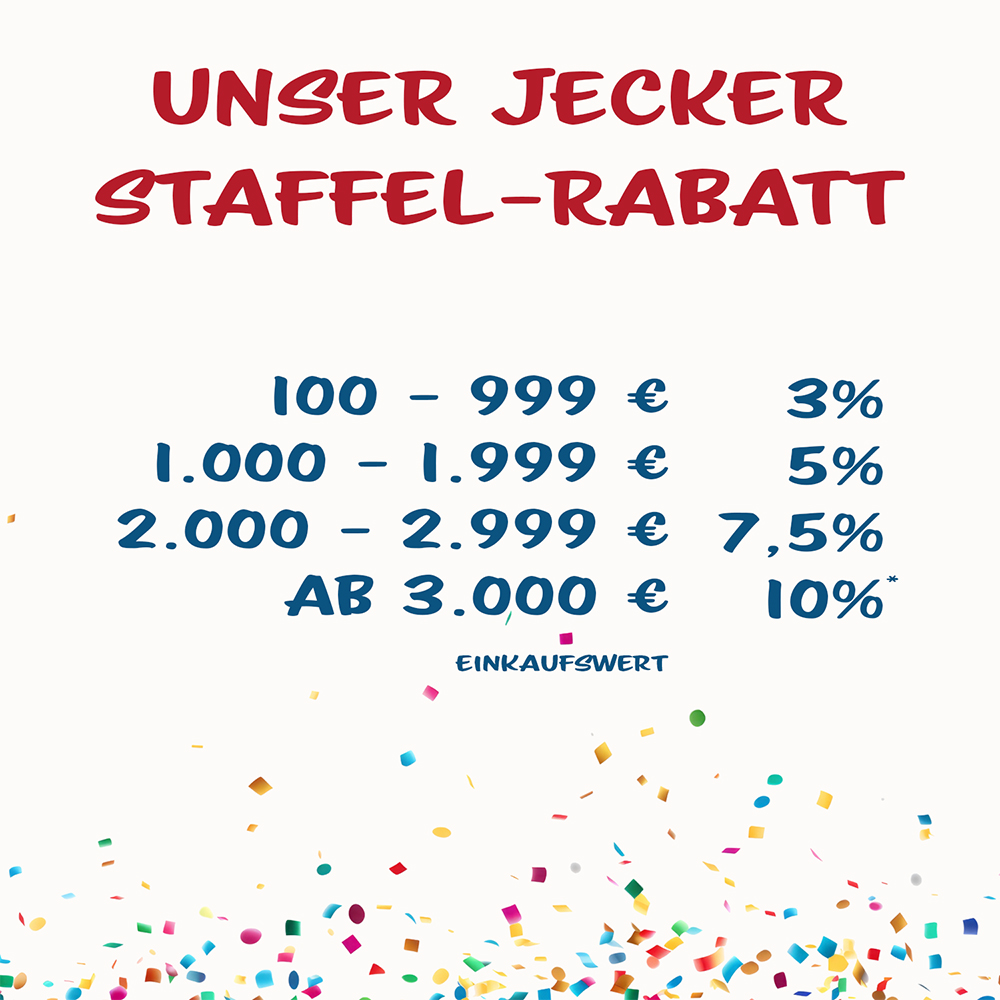 *Der Aktionszeitraum läuft bis einschließlich 17.02.2026. Der Rabatt wird entsprechend des Einkaufswertes automatisch vom Warenkorbwert abgezogen. Der maximal mögliche Rabatt gilt immer bei Zahlung per Vorkasse. Der Rabatt gilt nicht in Verbindung mit Individualangeboten und Montageleistungen.