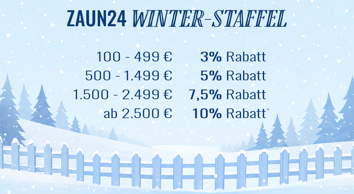 Sicher dir jetzt exklusiv bis einschließlich 26. Januar 2026 einen zusätzlichen individuellen Nachlass auf deine Bestellung. Spare jetzt mit unserer ZAUN24 Winter-Staffel!