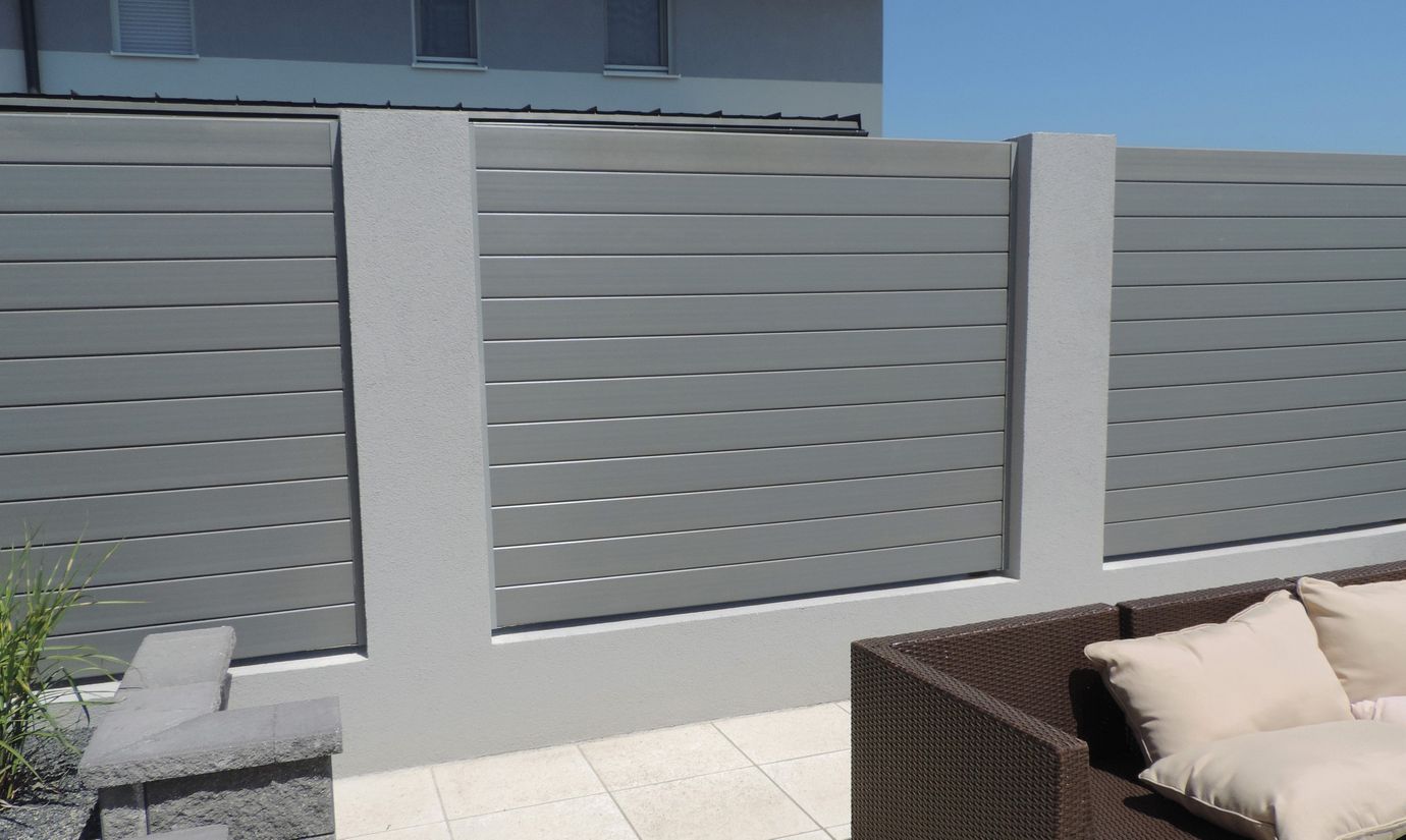 Zaun aus hochwertigen WPC-Profilen als Wind-, Sicht- und Lärmschutz, die im Nut- und Feder-System übereinander montiert werden.
